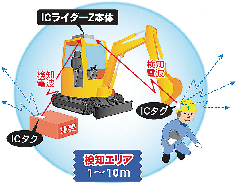 ・複数の重機が走る現場でも、作業員が持つICタグは1個で対応できるようにした。