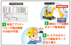 ・検知エリアを1~10mまで設定できることにより、重機の特性や作業環境に応じた運用が可能となる。