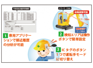 ・重機接近時の安全確保を、カラーコーンによる作業範囲の明示と監視員による確認から、ICタグを活用して作業員検知時に運転手に音と光で警報する方法に変えた。