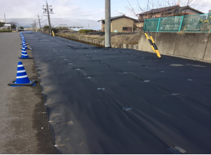 一般的な防草シートから、30年以上の耐候性を確保した改質アスファルト系保護シートに変えたことにより、
