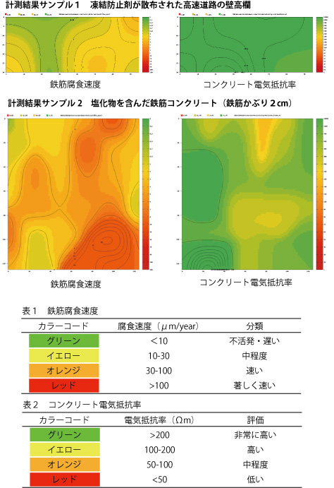 ・鉄筋腐食速度、コンクリート電気抵抗率を一度に測定することができる。