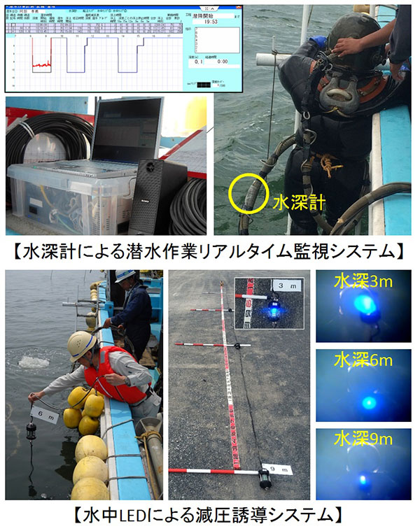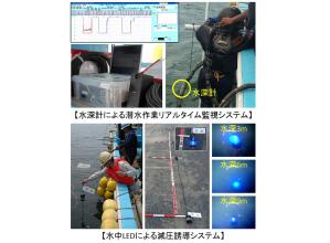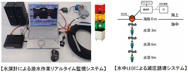 ・従来技術は、潜水士が、ダイブコンピュータによる潜水深度および時間の計測値を潜水連絡員へ連絡しながら、潜水作業の管理を行っていた。新技術は、潜水士に水深計を取付け、潜水士船においても潜水士の潜水深度および時間を自動的かつリアルタイムに監視できるようにした。