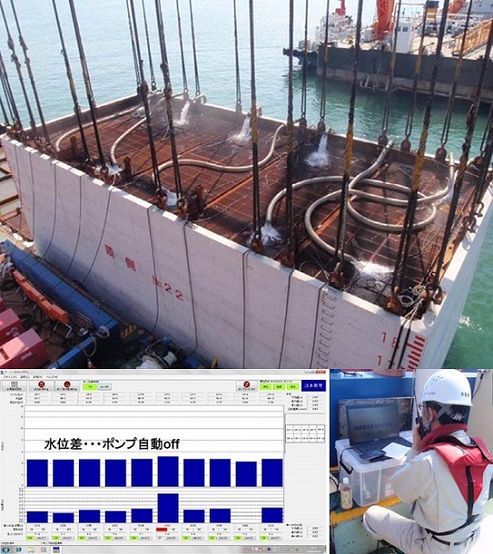 ・モニター画面に注水速度を表示することにより、ケーソンの据付(又は仮置)作業時のタイムテーブル管理に活用ができる。