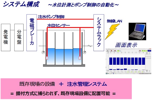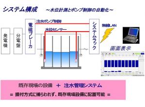 ・ポンプの自動制御を行うために、各桝の水位測定を、レッドによる人力測定から水位センサーによる自動測定に変え、制御システムに送られた測定結果を無線でPCに送り、そのPCの画面上に表示することによって、据付けようとするケーソンから離れた場所より各桝の水位高さや各桝間の水位差を確認できるようにした。