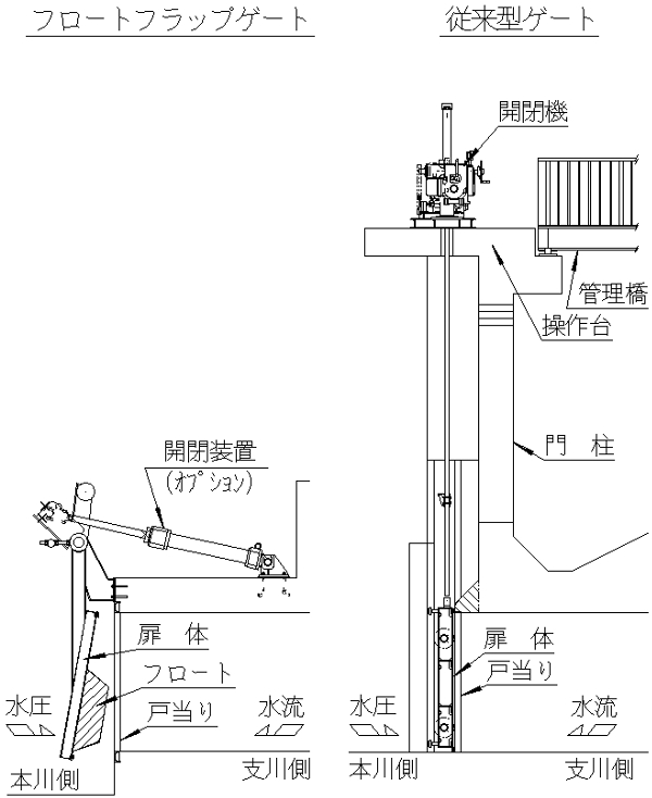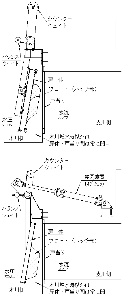 1)フロートにより、本川水位上昇時は浮力がゲートを閉鎖する方向に働き、より確実にゲートを閉鎖する。