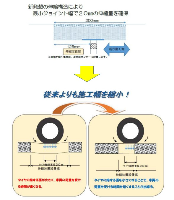 ・従来技術では特殊合材の中心位置は遊間の中心としていたが、『床版遊間と特殊合材(ラバトップMJコンパウンド)の中心位置をずらす』新発想の伸縮構造とした。