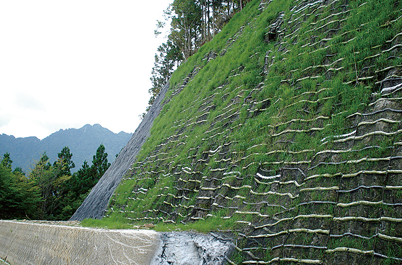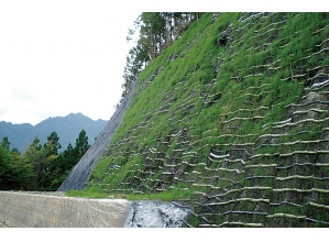 ・これにより法面の表面流速が遅くなり育成基盤の安定が図れることから、植生マットの適用を5分勾配法面まで可能とした(植生マットは通常8分より緩勾配に適用)。