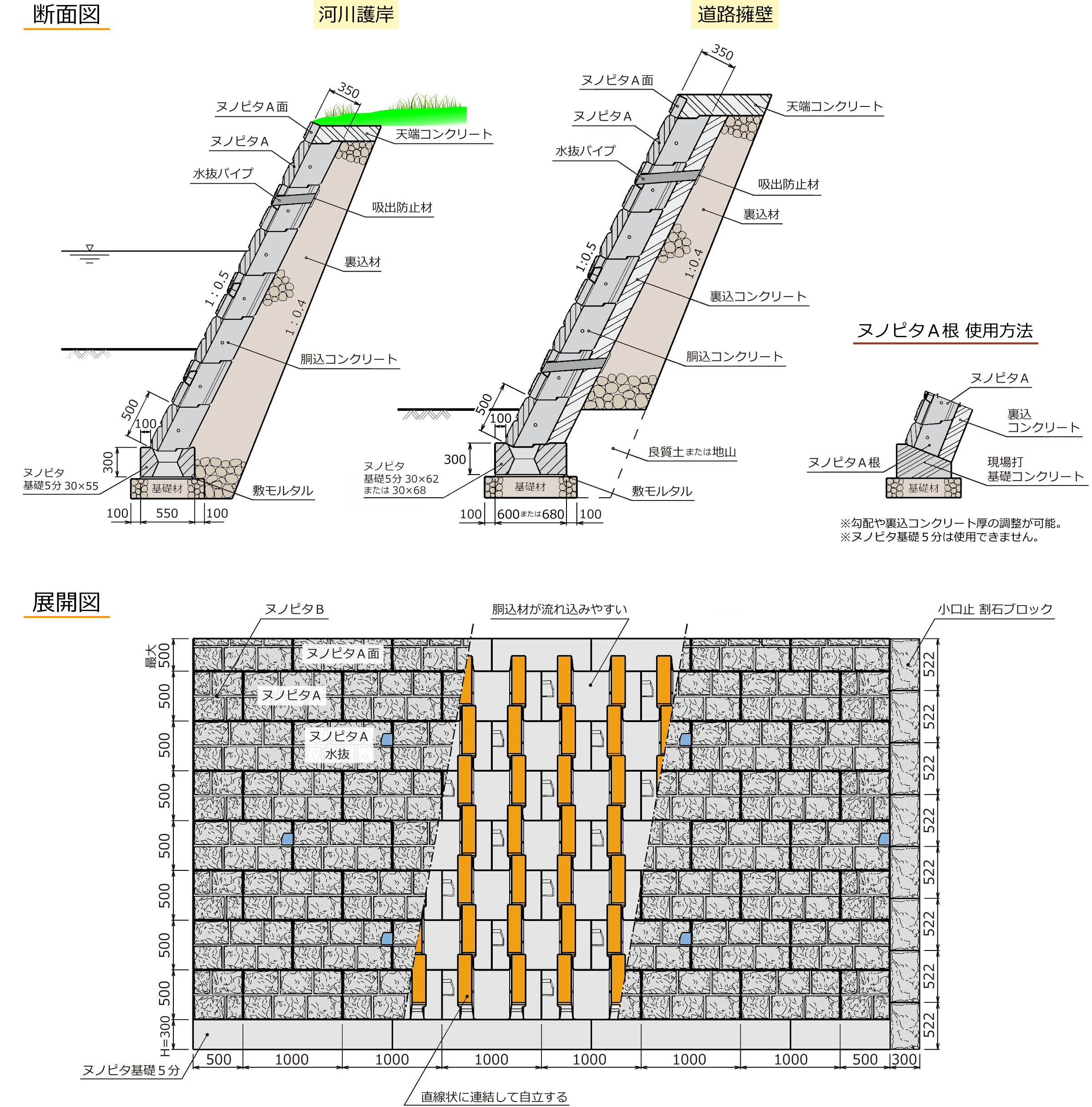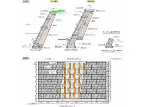 ・自立しない積みブロックを大型化し、控が水平状態で5分勾配に自立するブロックとした。