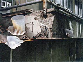 透明な接着剤で特殊ビニロンクロス(ニュークリアクロス)をコンクリートに貼り付け、含浸することで...