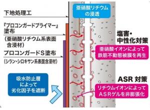 ・それに対し本技術は、亜硝酸リチウムとシラン・シロキサン系含浸材を組み合わせることで、「劣化因子の遮断」のみならず「鉄筋腐食抑制」、「アルカリシリカゲルの膨張抑制」にも期待できる。