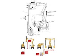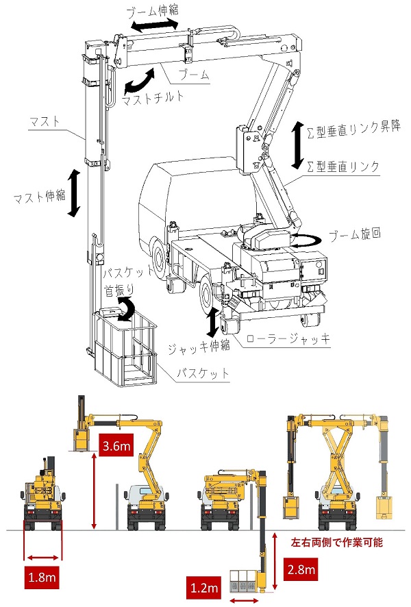 ・Σ型リンク式に変えたことで、高所作業装置の重心が低くなり、車両設置幅1.8mでの作業が可能となる。これにより路肩幅2.5mの現場では交通規制が最小限となり経済性と工程が向上する。