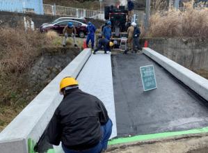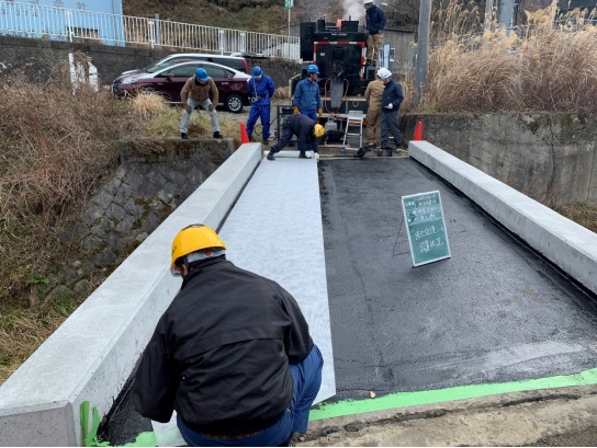 ・ウルトラシール3750と強化保護シートを組み合わせて橋梁の床板を防水工に専用機械(シールコーター100)を用いる工法とした。