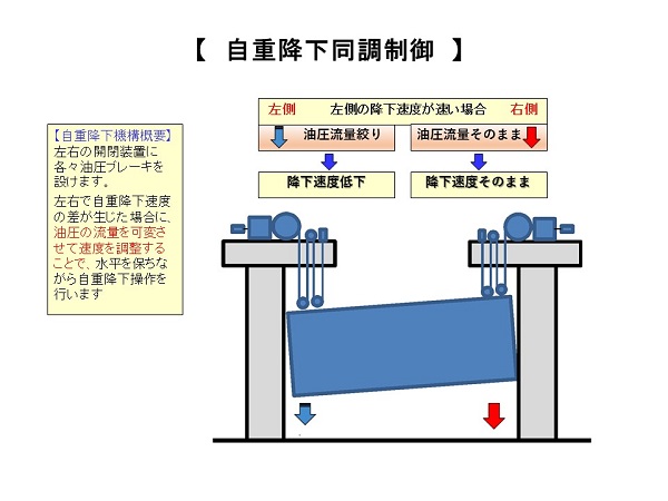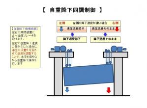 ・自重降下装置である油圧ブレーキユニットの油圧流量を可変することで、自重降下中に扉体の傾きを補正することが出来る。左右の扉体の傾きは、自重降下制御用のシンクロ発信器を設けて電気的に検知する。