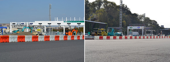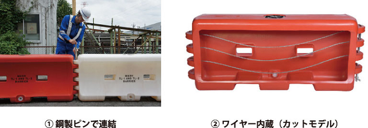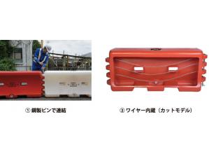 ・連結部を鋼製ピンに変え、ワイヤーを内蔵したことにより、車両衝突時には水だけではなくワイヤーでも衝撃吸収ができるようになり、樹脂製部分が破壊された後も連結されたワイヤーにより衝撃を吸収し、樹脂製仮設規制材の反対側への車両の進入を防ぐと共に、横転させることなく停止させることができ、安全性の向上が図れる。