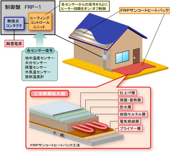 各種センサーによる自動制御でランニングコストを低減し、さらにFRPによる薄く丈夫な構造を生かし、自由度の高い施工を実現したあらゆるオーダーに柔軟に対応できる電気式融雪システム。 一般住宅のロードヒーティングやルーフヒーティングの他に、ビル屋上の駐車場ロードヒーティングにも使用。