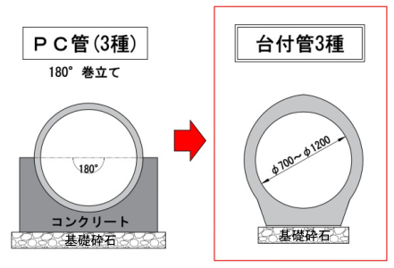 ・従来技術のプレストレストコンクリート管3種は、コンクリート180°巻立て基礎が必要であったが、新技術は、管と基礎が一体化した形状のコンクリート巻立て基礎が不要なパイプカルバート(台付管3種)になった。