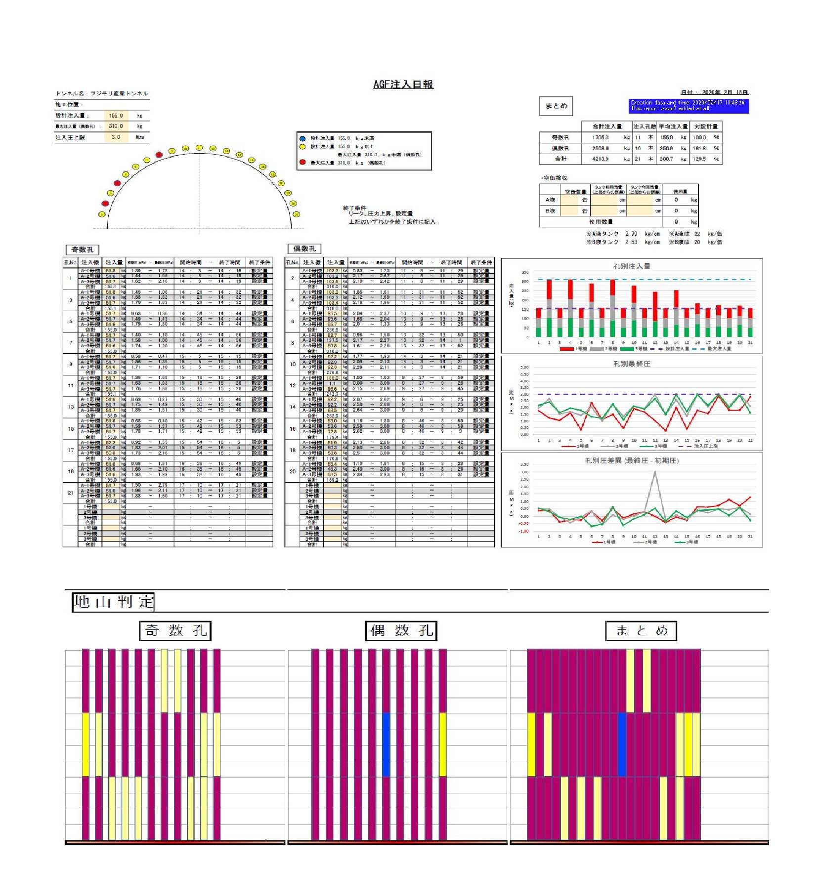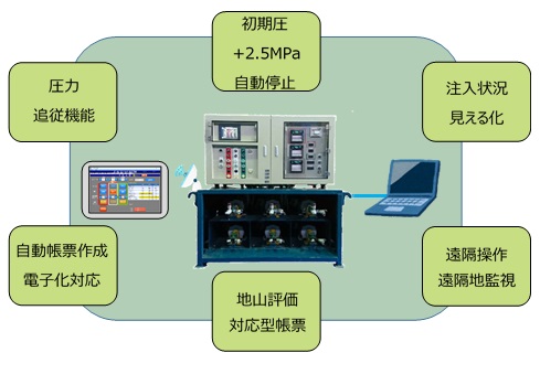 ・システムにより、帳票は自動作成され、注入量・圧力設定、リアルタイム監視により、削孔と注入を並行作業とすることでサイクルタイムを短縮でき、注入データを記入する作業員が不要となるため省人化が図れ施工性が向上