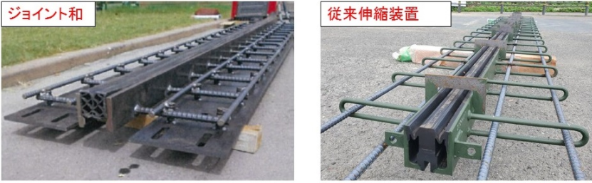 ・新技術は伸縮装置の固定で溶接工が不要となり、着脱可能なボルト連結構造とした。(従来技術は、伸縮装置を固定するために鉄筋に溶接する作業が必要である)