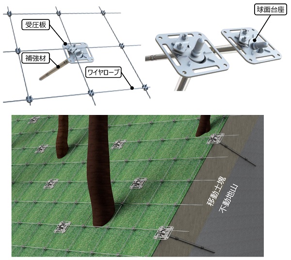 ・球面台座付きの受圧板とすることで、凹凸の大きい斜面でも補強材の角度調整が容易となり、施工性の向上が図れる。