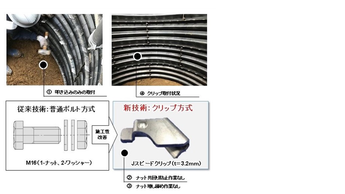 ・ライナープレート立坑構築における部材接合を、普通ボルト方式接合技術からクリップ方式接合技術に変えた。