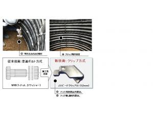 ・クリップ方式接合に変えたことにより、叩き込むだけで取付けが可能となり、ナット・座金取付け作業、共回り防止作業、増締作業が不要になり、施工性・経済性が向上し、工程が短縮される。