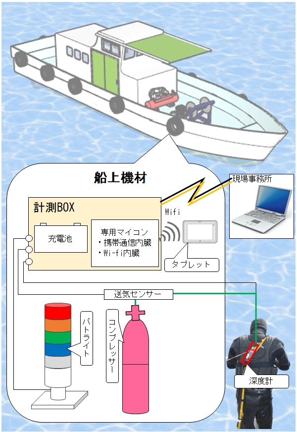 従来、作業報告は終業後の面談や携帯電話によるものでしたが、携帯通信網とクラウドを使用して作業状況(現在水深、潜水開始、潜水時間、浮上開始、浮上完了、減圧時間、減圧水深)が現場事務所の汎用パソコンから常時確認できるよう改善。