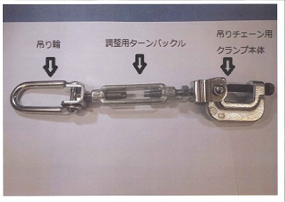 ・現行基準の吊りチェーン用クランプのつり部に、ターンバックルを組み込んでいる。