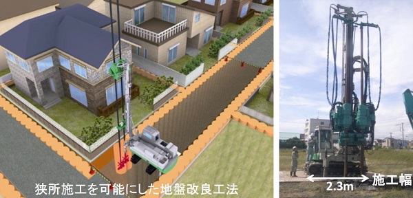 ・地盤改良機を小型改良機に変えたことにより、従来の大型機では施工困難とされた住宅地などの狭所における格子状改良の施工が可能となる。
