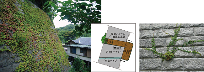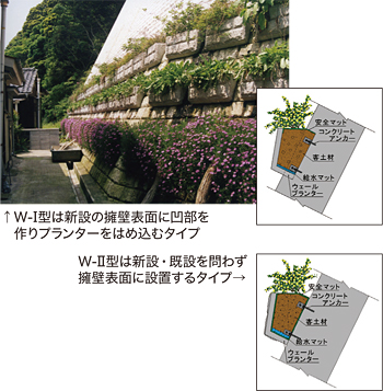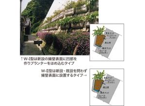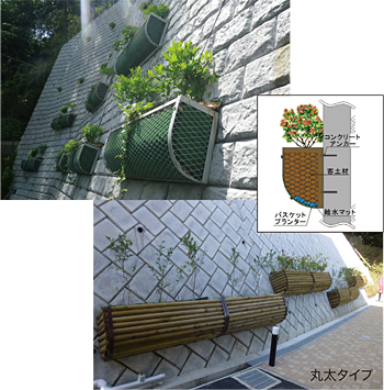 道路のり面、急傾斜地などのコンクリート擁壁は空間規模が長大で圧迫感があり景観や生活環境を損うことがある。ウォールポケット工法はそのようなコンクリート構造物に、景観に配慮したプランターを設置し、花木やつる植物を植栽し緑化することでアメニティ空間を創出できる、自然や周辺環境との調和を重視する壁面緑化工法である。