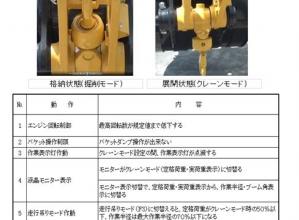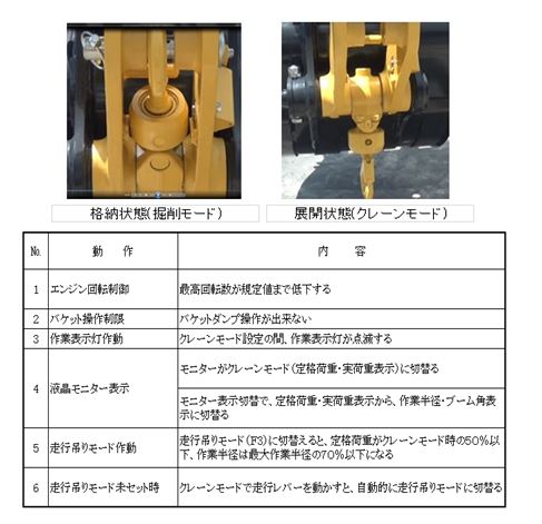 1)掘削モードでクレーンフックを展開すると警告音とともに、油圧操作が全停止することで掘削モードでの吊り作業を制限する。