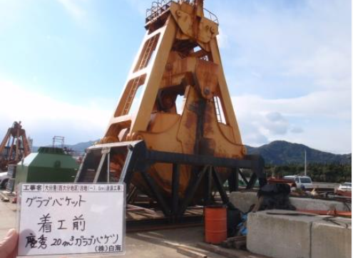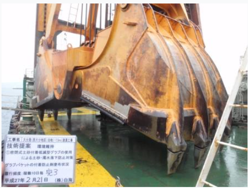 ・普通地盤用グラブバケット(密閉式)に加え、バケット側面部に、土砂・濁水の漏出防止用ゴムパッキンを施すことで、バケットから零れ落ちる土砂・濁水の流出を防止できる。また、土砂付着低減剤をバケットの内面及び外面部に塗布することで、バケットに土砂がくっつかず、バケット旋回時に土砂が海上及び河川上へ落下することを防止できる。