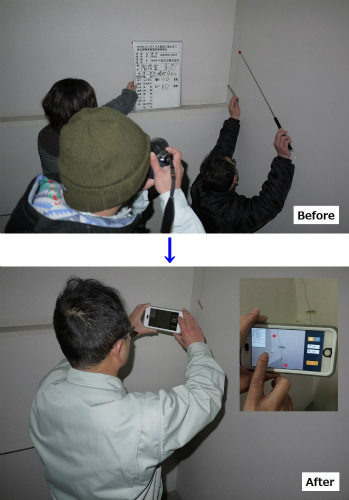 新技術では、黒(白)板情報と指し棒代わりの矢印を表示させたスマートフォン又はタブレット端末を使って撮影を行いサーバーにアップロードすれば、写真帳と調査書が自動作成されるようにした。