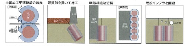 ・特殊自走式マシンに変えたことにより、斜め方向への施工が可能となるほか、鉛直から斜め方向まであらゆる角度に容易に調整できるため、柔軟性の向上が図れる。