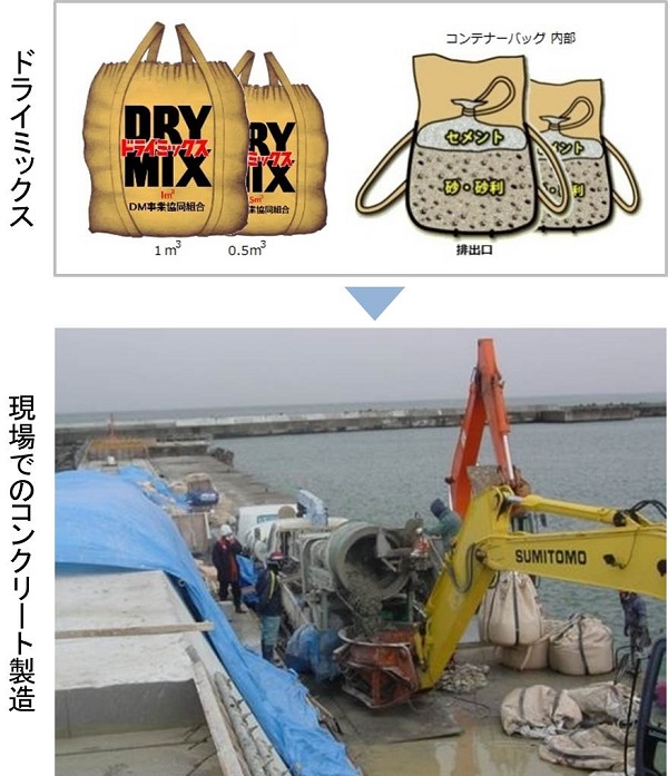・ドライミックスは、所定の配合で計量した袋詰め製品とし、1m³、0.5m³、0.3m³、5~25kg小袋から選定できるようにした。