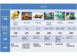 ・ミキサーは、練混ぜドラム容量、攪拌方式、排出方式、練混ぜ水計量・供給方式、薬剤計量・注入方式等、各種バリエーションを選定できるようにした。