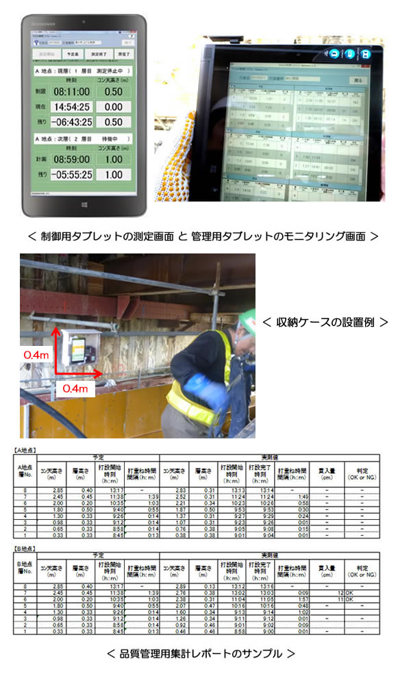 ・打設状況を制御・表示用タブレットの画面上で逐次確認できるようにしたため、各層の打設完了からの経過時間と残り時間が表示され、打設作業の効率化と進捗確認が的確になるので、品質が向上する。