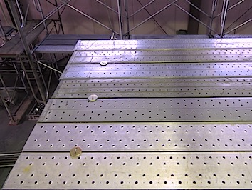 本製品はフック状の金具ボルトにて下部の単管に引っ掛け、足場板上部に厚みの薄い円状金具のナットをインパクトレンチ等にて締結し固定する技術である。