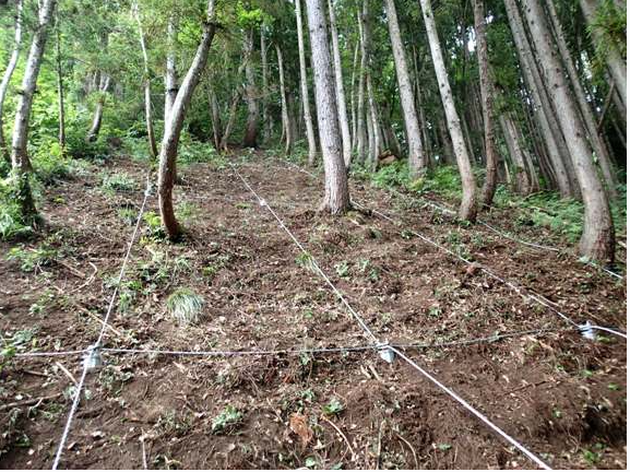 足場や重機を使用せずにMF杭を設置できることや、支圧板などが不要で部材数が少量であることから、雑木や植林の伐採が最小限で施工でき、自然林の緑の美観を損なわない。