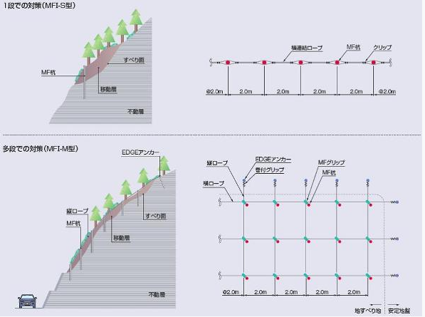 不安定な移動層を突き抜き、安定した不動層にMF杭(鋼管杭)を挿入し、充填グラウトによって地盤に密着するように設置することで、不安定な移動層(1.0~3.0m)を補強し、表層崩壊を予防することができる。鉄筋よりも断面係数の大きい鋼管を使用することで、受け持つ土砂の範囲が大きくなり、単位面積当たりの部材数量を従来よりも減少できるため、経済性及び景観性の向上が図れる工法である。