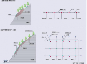 MF杭の杭頭部を縦・横方向にロープで連結することで、相互の持合い効果と応力分散効果を発揮し、本来のMF杭の能力に加え、斜面全体の安定性が向上する。ロープの特性上、既存の雑木や植林の妨げにならず、元の景観を損なわずに施工できる。