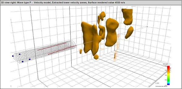 ・トンネル設計時の地山区分は主として弾性波速度に基づいて行われており、TSP303による予測値(同一速度のレンダリング表示(下図参照)や速度分布)とトンネル設計時に探査した弾性波速度値とその範囲との対比が容易にでき、地山区分の評価が合理的に行えるようになる。特にトンネル掘削に悪影響を及ぼす断層破砕帯の規模を明らかにすることができる。