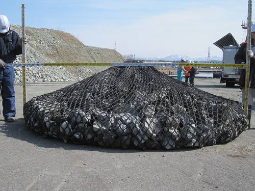 ・合成繊維で作られた袋体は、均一な粒径の中詰め材の替わりに現場発生材(玉石、割栗石、割石)および建設廃棄物(コンクリート塊)が使用できるため、環境負荷を低減でき、コスト縮減が図れる。