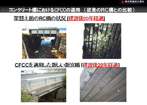 ・炭素繊維とエポキシ樹脂の複合材CFCCをPC構造物の緊張材として適用できるようにしたことで、従来の鋼材による緊張材の錆による劣化の心配を無くした。