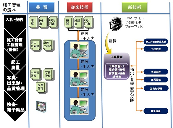 ・工事名、工事箇所、工期、工種、数量等を共通フォ-マットであるTOMファイルへの変換機能に対応した積算ソフトにてデ-タを出力し、本システムで取り込むことでデ-タ入力時間の短縮が図れる。