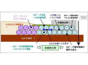 (ヘドロ化している底泥に覆砂または混合することで,水中への硫化物イオンの溶出を抑制。Hiビーズは、硫化物イオンの吸着能力が高いため溶出抑制効果が継続する。)