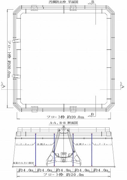 汚濁防止枠フロート一辺(約20m)に約4m間隔で計4本(四辺合計16本)のチェーンをカーテンの内側に取り付け、その下部を重量の大きい鋼材に連結する。カーテンの内側にチェーンの壁を形成することにより、内側へのたわみを阻止する。