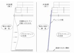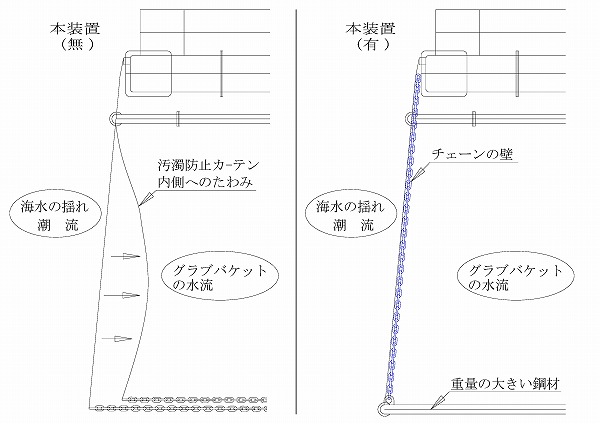 従来は、海水の揺れ、潮流によりカーテンが動揺し、グラブバケットの水流により内側へ移動することでバケットに引っかかり破損していた。