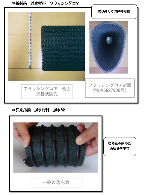 ・'新技術:フラッシングコアであるろ過構造体は、地下埋設されず、露出部分があるとともに、網目開口があるため、汚泥等が堆積しにくく、維持管理の清掃で目づまりが解消できる。