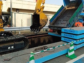 ・従来技術よりも覆工板台数が少なくなり、また従来技術では毎日受桁の設置・撤去も必要であるが、本技術では不要である(覆工板の撤去のみで十分な開口を得られる)ため、毎日の覆工板撤去・設置の時間が短くてすむ。その結果、本体工事に多くの時間をかけられる。