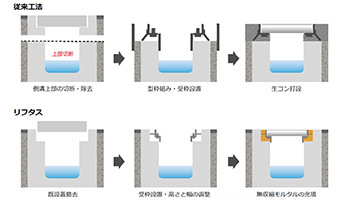 ・既設の側溝の上部を切断するなどの工程が不要のため、工期の短縮に繋がる。